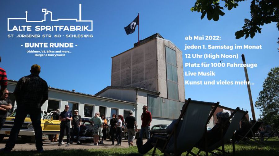 06.08. Bunte Runde jeden 1. Samstag ab 12 Uhr(high noon) bis zu 1000 Fahrzeuge (7 Hektar) Beste Burger & Kurrywurst nördlich vom Pott Live Music Kunst in der Alten Spritfabrik in Schleswig. St. Jürgener Str. 60